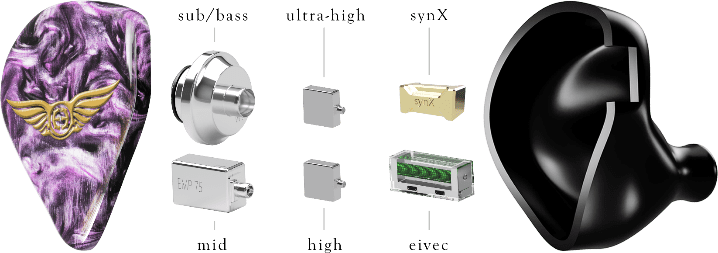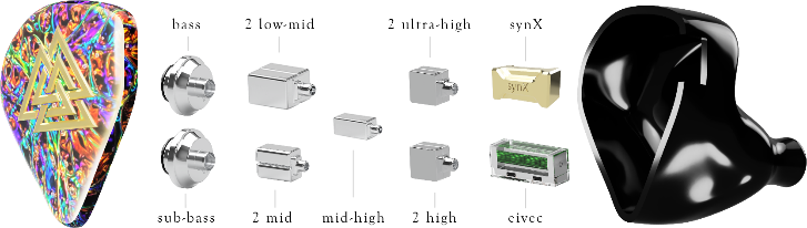 中、中高及高音部份由專屬定製的動鐵單元所負責,透過自家獨有的synX 6路分音技術及A.R.C.吸震塗層吸收大部分諧震,令所有組件更加穩定,帶出豐富,人聲自然又充滿極高音樂細節的表現。