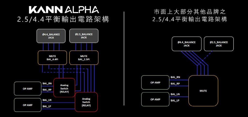 AK 於 KANN ALPHA 內重新設計其平衡輸出插頭,並於機身內加入兩組全獨立線路,分開兩組各自獨立之放大器(OP AMP)及類比開關(Analog Switch)予其 2.5mm 及 4.4mm 輸出。由於兩組平衡輸出電路完全分隔,因而可有效減少因線路重疊做成的干擾,更可令平衡輸出對底噪的抑壓及控制力大幅增加,達至極寧靜漆黑之背景。KANN ALPHA 的 4.4mm 平衡輸出用上五極接地電路設計,可大幅減少聲音中的電流雜訊,令音色更純粹潔淨。即使用家於使用最高功率放大輸出時,常見的底噪放大問題亦因其串擾獨立線路設計而大幅減少,令用家可於 寧靜背景下完全發揮其耳機的所有潛能,並提升其音質表現。