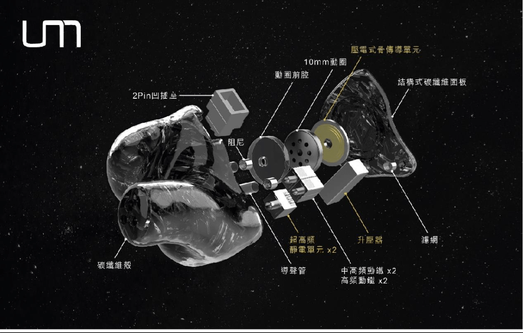骨傳導單元不需要導音管,對氣流不敏感,且聲音可在腔體任何位置傳遞,完全避免了高頻噪音干擾,聲音的失真度亦極低。UM 讓單元只工作在中高頻,其一是是輔助中高音單元的過渡,其二是因為骨傳導單元的運作模式,令它的迅態及結像力非常出色,優勢於中高頻更加明顯。