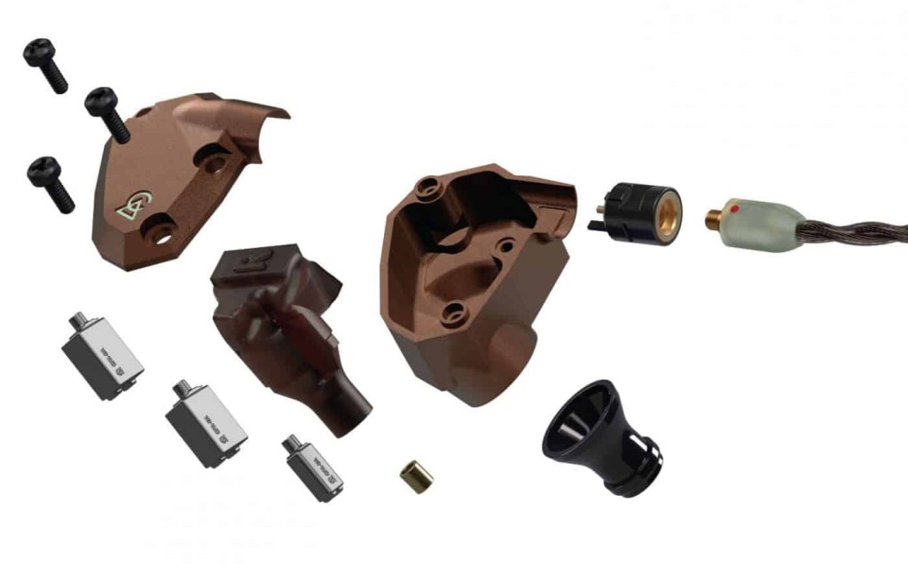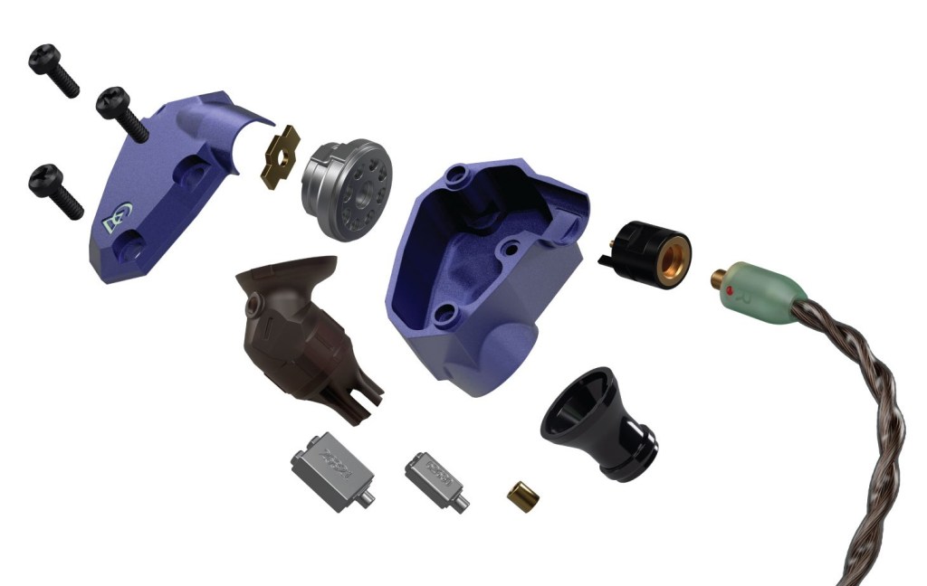 耳機配備兩顆定制動鐵單元,主要負責高及中音;另外有一顆全新的10mm生物纖維振膜(bio-cellulose diaphragms)單動圈負責低音部份。動圈帶出濃郁而深邃的感覺,bass drum及floor tom的音色立體逼真,仿如置身現場一樣。