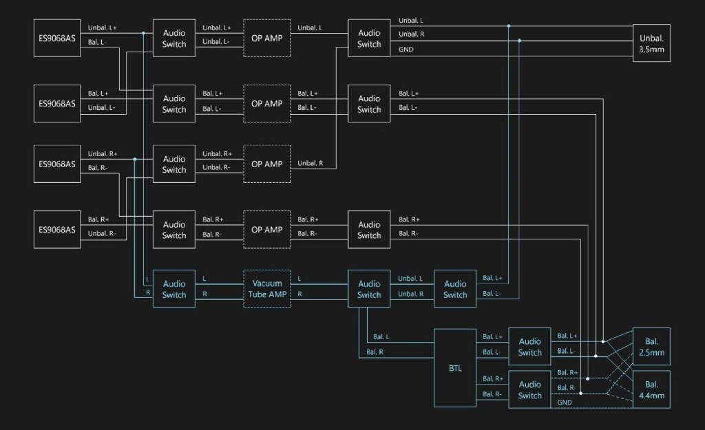 除首次採用真空管放大及混合放大模式外,SP2000T 亦為 Astell&Kern 首次採用四組 ESS Technology ES9068AS 解碼芯片之播放器。