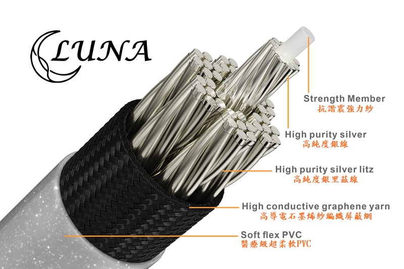 LUNA使用了多種純銀導體及高導電石墨烯編織紗作為屏蔽層,較一般同質純銀耳機線具有更好的幾個聲音特質: